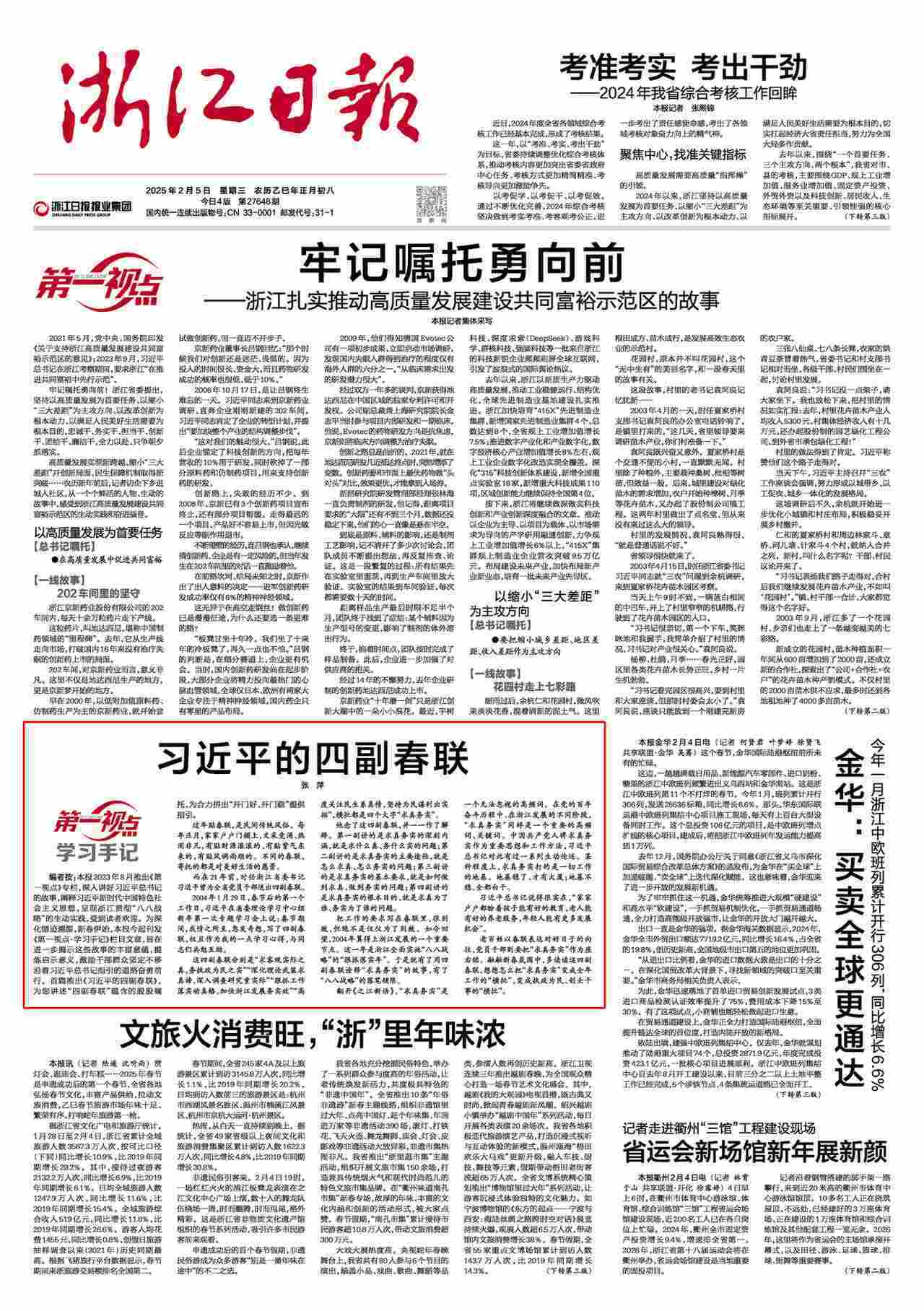 把工作的要求寫在春聯(lián)里,很別致,但絕不是僅僅為了別致。如今回望,2004年算得上浙江發(fā)展的一個重要節(jié)點(diǎn)。這一年是浙江全面實施“八八戰(zhàn)略”的“狠抓落實年”。于是就有了用四副春聯(lián)詮釋“求真務(wù)實”的故事,有了“八八戰(zhàn)略”的落筆鋪陳。