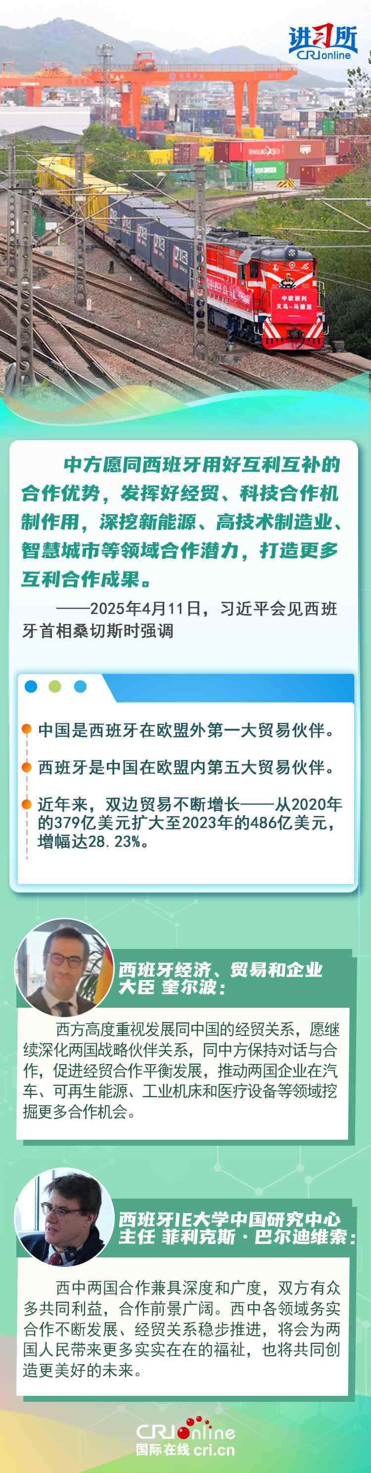 今年是中西全面戰(zhàn)略伙伴關(guān)系建立20周年,也是中歐建交50周年。多年來,中西兩國領(lǐng)導人保持密切互動,秉持互尊互信、互利共贏精神,兩國在深化貿(mào)易、投資、科技創(chuàng)新、綠色能源等領(lǐng)域取得豐富合作成果,雙邊關(guān)系走在中國同歐洲國家關(guān)系前列。在西班牙人士眼中,良好的對華關(guān)系對西班牙、歐洲和世界具有重要意義,將會為兩國人民帶來更多實實在在的福祉,也將共同創(chuàng)造更美好的未來。
