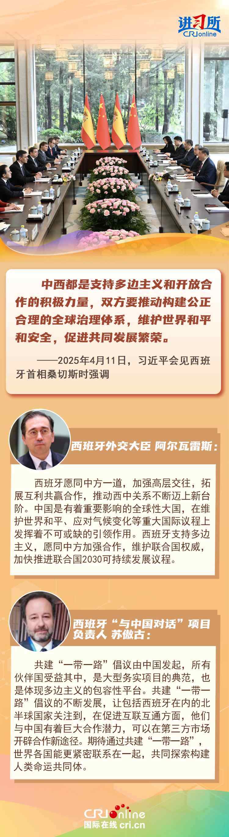4月11日,中國國家主席習近平在北京會見來華訪問的西班牙首相桑切斯時表示,中西友好是兩國人民基于傳統(tǒng)友誼、現(xiàn)實需要、長遠利益作出的正確抉擇,中西都是支持多邊主義和開放合作的積極力量,雙方要推動構(gòu)建公正合理的全球治理體系,維護世界和平和安全,促進共同發(fā)展繁榮。