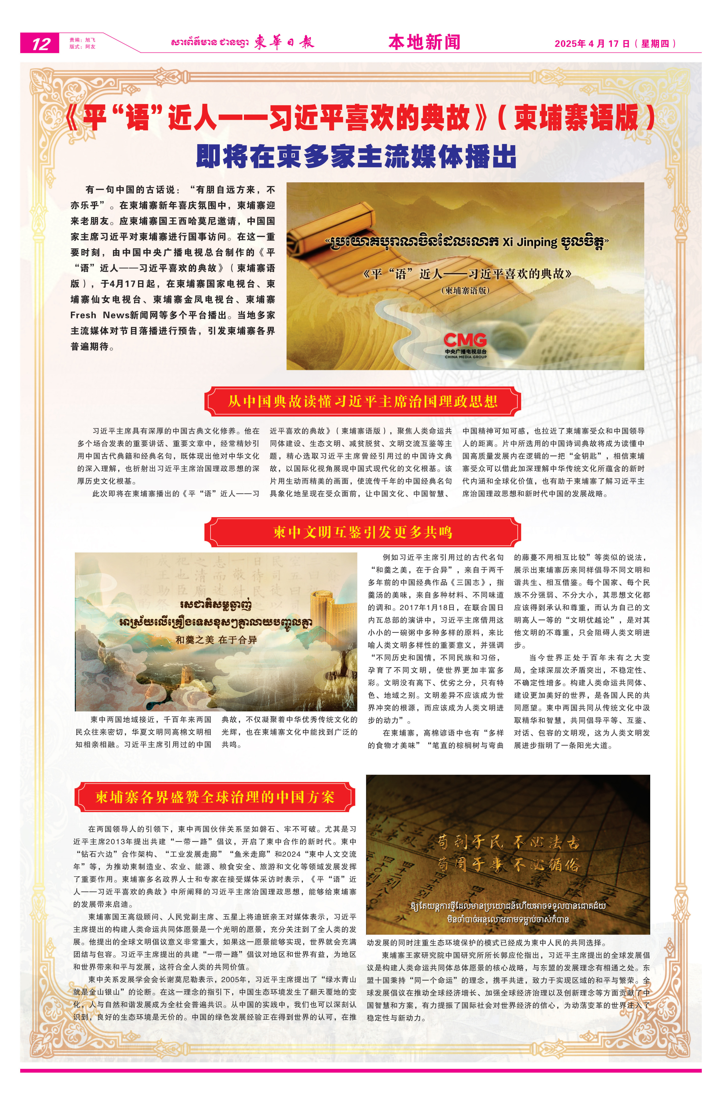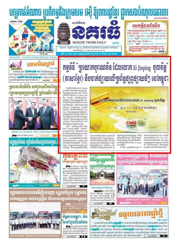 4月12日至17日,《柬華日報》《大都市報》等當?shù)貓蠹埧l(fā)節(jié)目播出預告消息。文章指出,《平“語”近人——習近平喜歡的典故》(柬埔寨語版)是一把讀懂中國高質量發(fā)展內在邏輯的“金鑰匙”,相信柬埔寨受眾可以通過這些中國古籍和經典名句加深理解中華優(yōu)秀傳統(tǒng)文化所蘊含的新時代內涵和全球化價值,了解習近平主席治國理政思想和新時代中國的發(fā)展戰(zhàn)略。