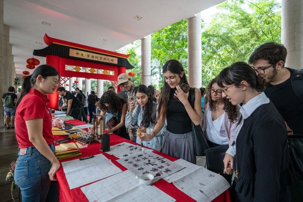 △2025年4月,在巴西里約熱內(nèi)盧天主教大學(xué)舉辦的“國際中文日”慶祝活動上,學(xué)生們體驗中文書法。