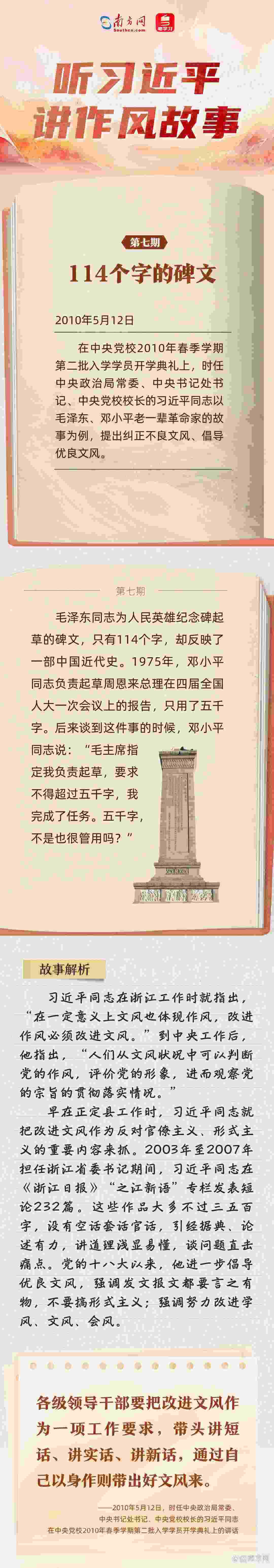 當前,全黨上下正在開展深入貫徹中央八項規(guī)定精神學習教育,縱深推進作風建設(shè)。關(guān)于作風建設(shè),習近平總書記常用講故事的方式,傳達深意、感染他人,給人以思想啟迪。南方網(wǎng)、粵學習客戶端推出“聽習近平講作風故事”系列報道,與您一起感悟這些故事蘊含的深刻道理。 今天,推出《聽習近平講作風故事⑦丨114個字的碑文》,與您一起學習毛澤東、鄧小平老一輩革命家的文風。