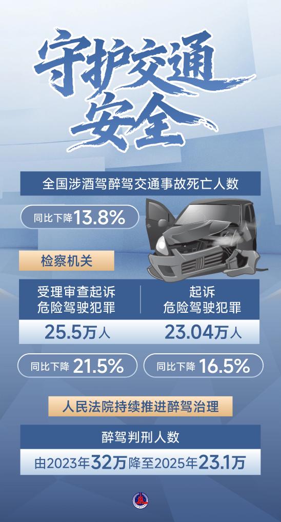 最高法報(bào)告指出,辦理醉駕刑事案件意見出臺后,判刑人數(shù)由2023年32萬降至2025年23.1萬,因酒駕造成交通事故及致死、致傷數(shù)量均有下降。同時,明確“駕駛?cè)俗砭坪髥⒂幂o助駕駛功能仍應(yīng)承擔(dān)刑事責(zé)任”。