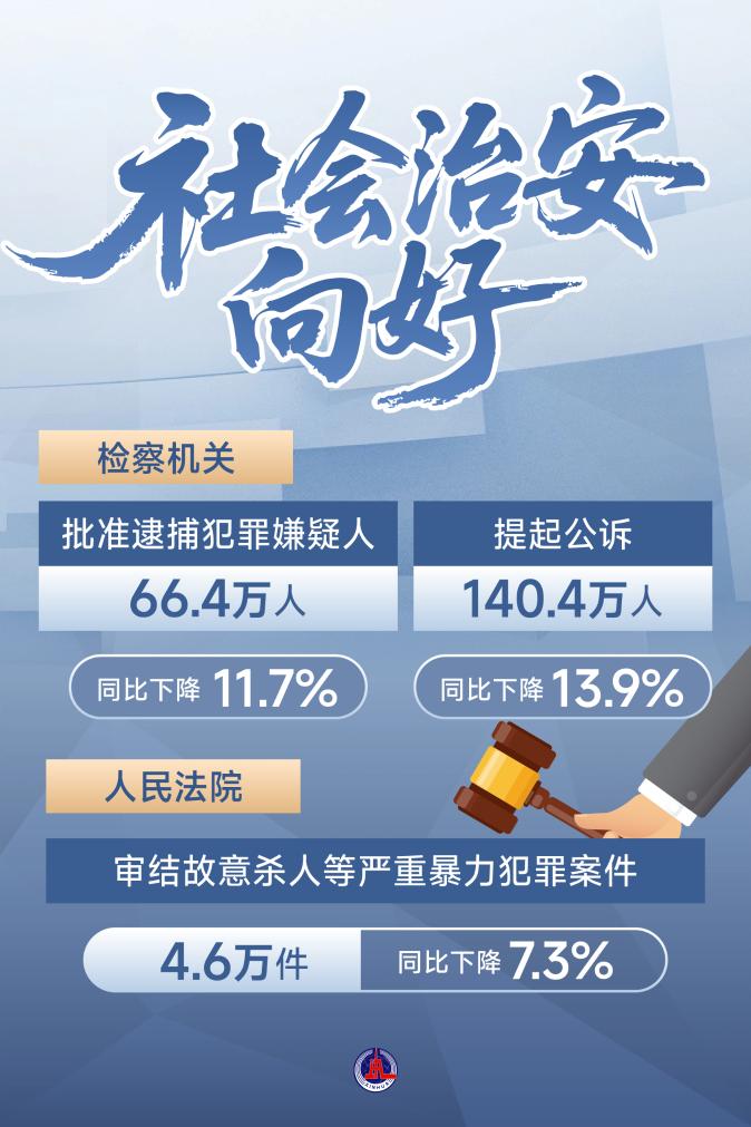 ——社會治安向好,檢察機(jī)關(guān)批捕、起訴人數(shù)均同比下降10%以上。