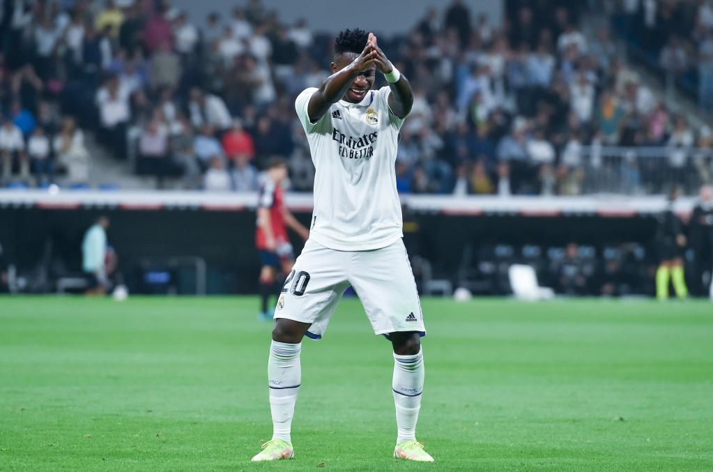 10月2日,代表皇馬出賽的維尼修斯在西甲比賽中慶祝進(jìn)球。新華社發(fā)(古斯塔沃·巴連特?cái)z)