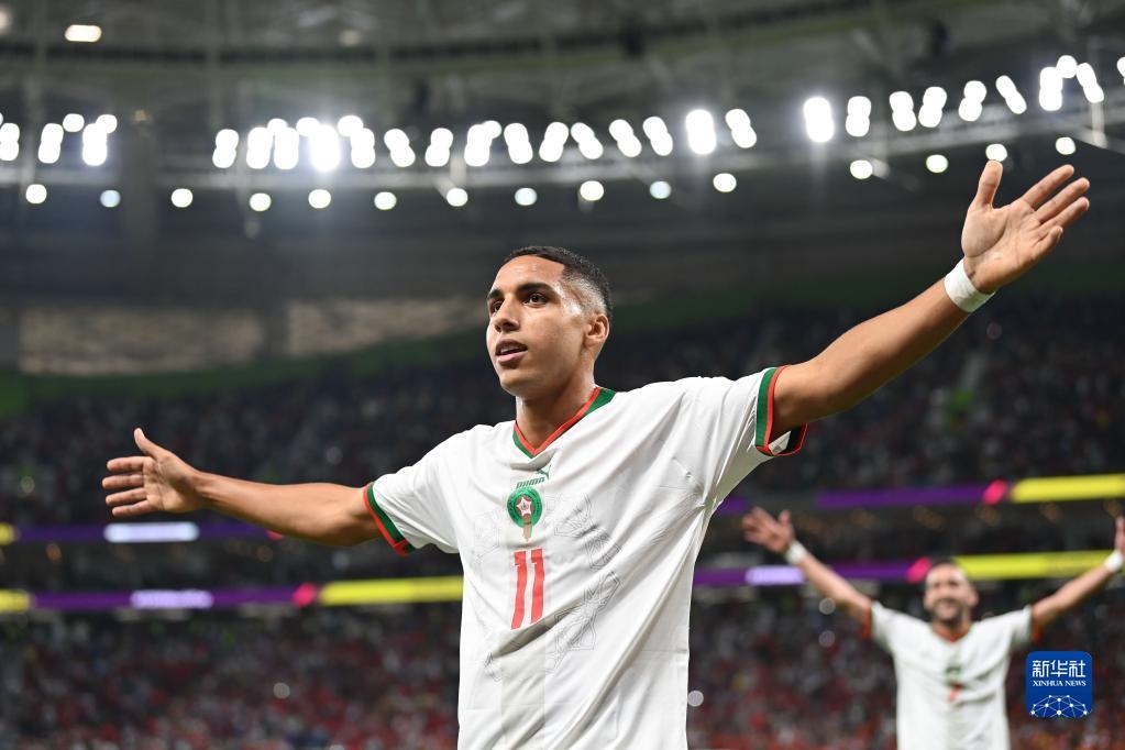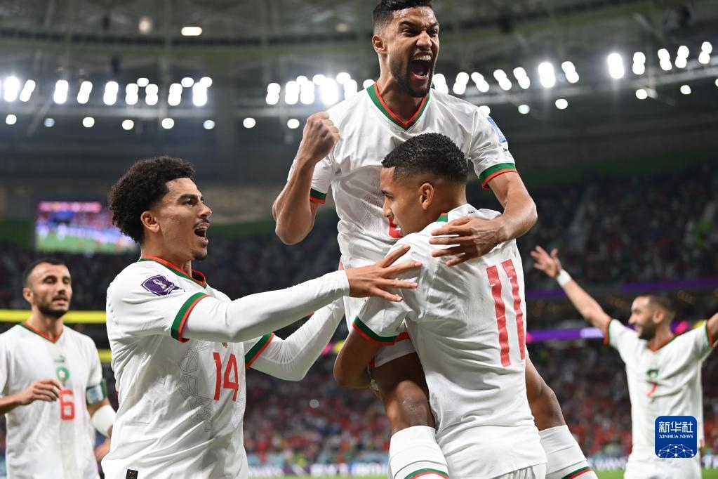 11月27日,摩洛哥隊(duì)球員阿布赫拉爾(右二,14號(hào))打入球隊(duì)第二粒進(jìn)球。新華社記者 徐子鑒 攝