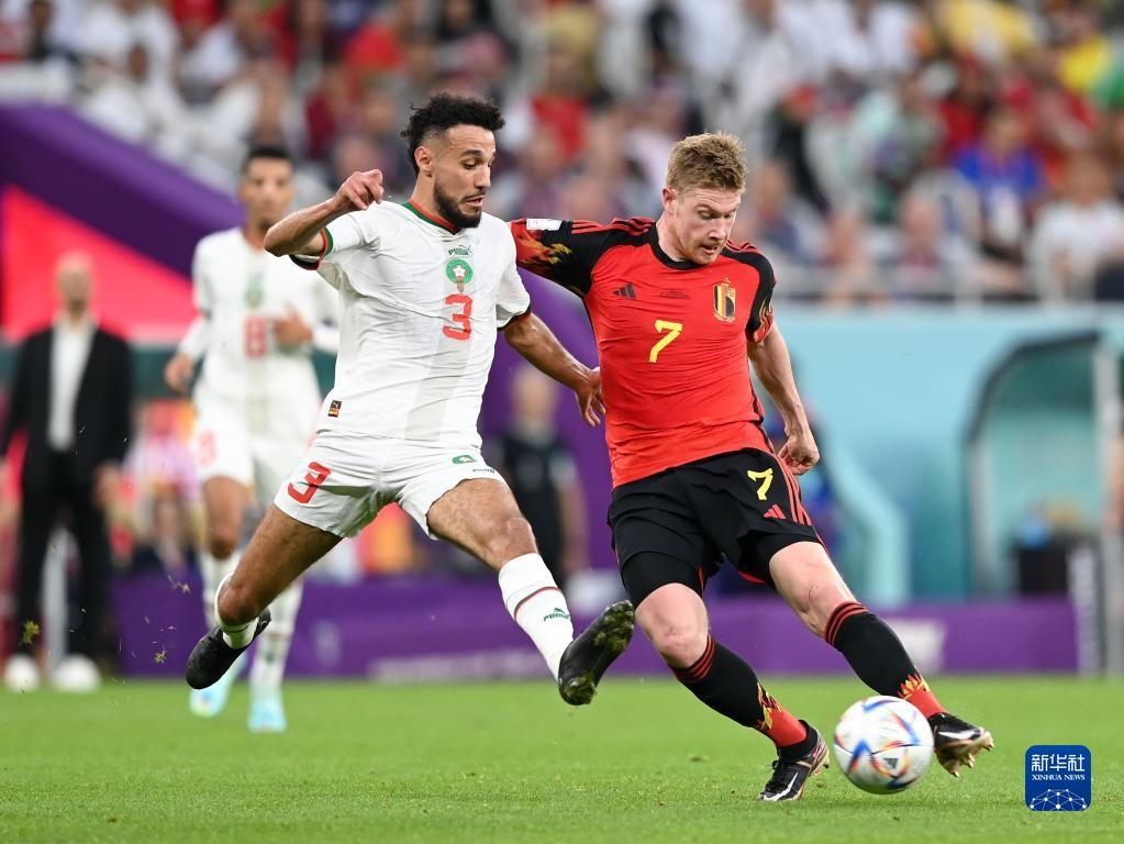 11月27日,比利時(shí)隊(duì)球員德布勞內(nèi)(右)與摩洛哥隊(duì)球員馬茲拉維拼搶。新華社記者 李俊東 攝