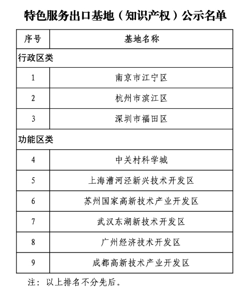 據(jù)國家知識產(chǎn)權(quán)局官網(wǎng)消息,根據(jù)《商務(wù)部等7部門辦公廳(室)關(guān)于組織申報專業(yè)類特色服務(wù)出口基地的通知》(商辦服貿(mào)函〔2021〕355號)要求,經(jīng)地方申報、省市知識產(chǎn)權(quán)和商務(wù)主管部門初審?fù)扑]、第三方機(jī)構(gòu)客觀指標(biāo)評審、專家評審、部門工作組復(fù)核等程序,初步認(rèn)定知識產(chǎn)權(quán)服務(wù)出口基地9家,名單于2月7日-2月11日進(jìn)行公示。