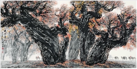 梁先生曾旅居西藏四個(gè)月,不僅為人民大會(huì)堂西藏廳創(chuàng)作了巨幅國(guó)畫(huà)《雪山雄鷹》,同時(shí)收獲了數(shù)百?gòu)埶賹?xiě)和寫(xiě)生稿。他還四上黃山,兩次到三峽。2000年,70多歲的梁世雄又深入新疆無(wú)人區(qū)胡楊林中進(jìn)行素材收集。此后,大漠胡楊成了梁世雄作品新的視覺(jué)符號(hào)。