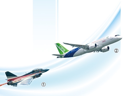 圖①:殲—10戰(zhàn)機。中國航空博物館供圖 圖②:C919國產(chǎn)大飛機。徐炳南攝
