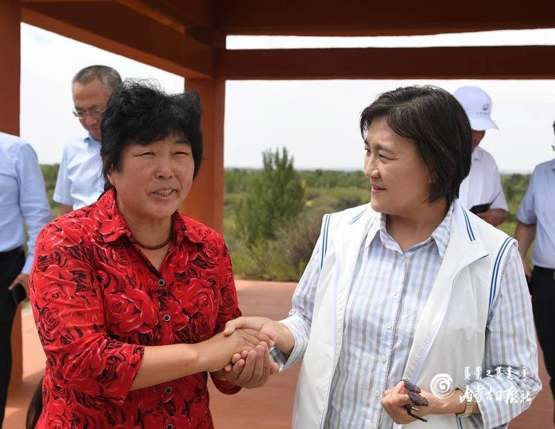 烏蘭陶勒蓋治沙站位于烏審旗毛烏素沙地腹部,建站40多年來,以治沙造林、保護森林資源為己任,一代接著一代干,防沙治沙工作取得了明顯成效。布小林來到烏蘭陶勒蓋治沙站,調研治沙造林工作,并與全國“三八·綠色獎章”獲得者殷玉珍親切交流,對當?shù)厣鷳B(tài)治理的模式和成效給予肯定。她還來到伊金霍洛旗紅慶河鎮(zhèn),考察鄉(xiāng)村治理、消費扶貧等工作。