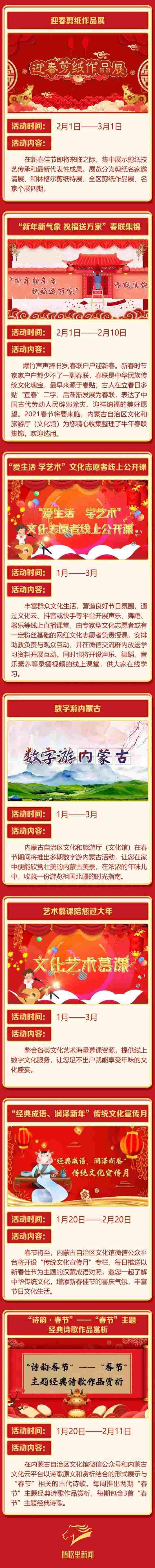 2021年春節(jié)的腳步越來越近,為豐富春節(jié)期間廣大群眾的精神文化生活,營造歡樂、團(tuán)圓、喜慶、祥和的節(jié)日氛圍,內(nèi)蒙古自治區(qū)文化和旅游廳(文化館)于2021年1月至3月將推出“中華文化進(jìn)萬家”系列群眾文化線上活動(dòng)。