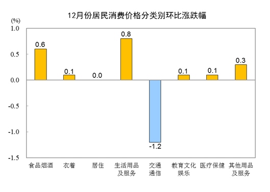 12月份,全國(guó)居民消費(fèi)價(jià)格環(huán)比上漲0.1%。其中,城市上漲0.1%,農(nóng)村上漲0.1%;食品價(jià)格上漲0.9%,非食品價(jià)格下降0.1%;消費(fèi)品價(jià)格上漲0.1%,服務(wù)價(jià)格上漲0.1%。
