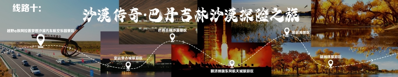 線路行程由阿拉善出發(fā),至參觀越野e族阿拉善夢想沙漠汽車航空樂園景區(qū),至定遠營古城旅游區(qū),至巴丹吉林沙漠景區(qū),再至額濟納旗東風航天城旅游區(qū),再至居延海景區(qū),終點為胡楊林旅游區(qū)。