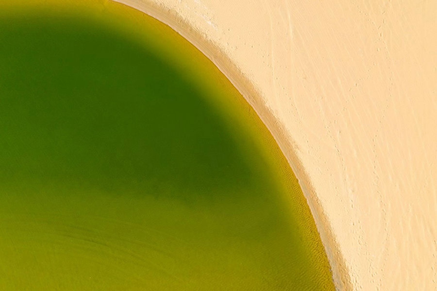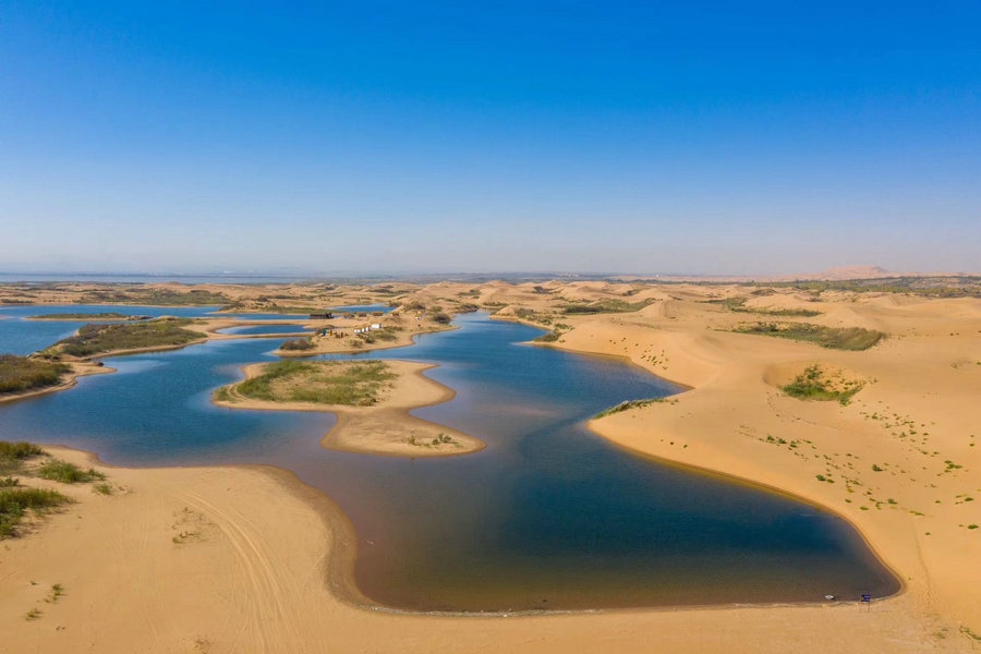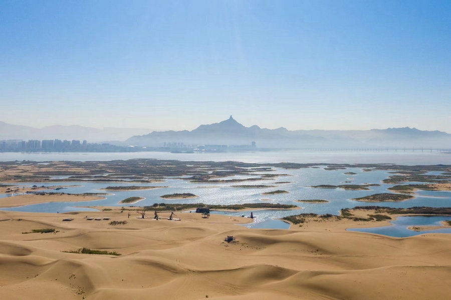 烏海湖與浩瀚的烏蘭布和沙漠相連,形成沙水相連自然景觀,平靜的湖面猶如一面巨大的鏡子,將湛藍的天空和金色的沙漠倒映其中。