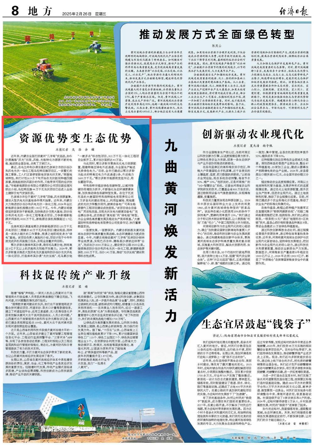 2025年2月26日,《經(jīng)濟日報》第8版刊發(fā)題為《資源優(yōu)勢變生態(tài)優(yōu)勢》的文章,報道了近年來,內(nèi)蒙古全面打好黃河“幾字彎”攻堅戰(zhàn),如今沙漠瀚海“風光”無限,風能、光能轉(zhuǎn)化為源源不斷的電能,輸送到全國各地,點亮了萬家燈火。
