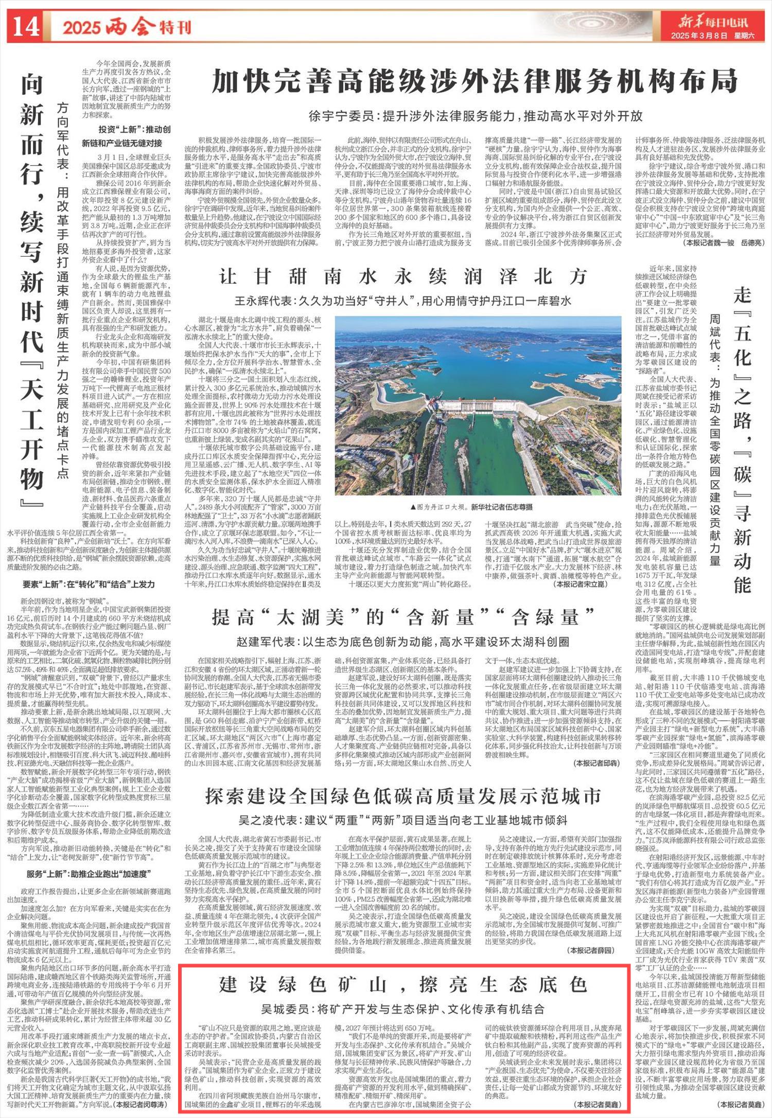 2025年3月8日,《新華每日電訊》第14版刊發(fā)題為《建設(shè)綠色礦山,擦亮生態(tài)底色》的消息,報(bào)道了吳城委員介紹,“我們不是單純的資源開采,而是要將礦產(chǎn)開發(fā)與生態(tài)保護(hù)、文化傳承有機(jī)結(jié)合?!?/p>