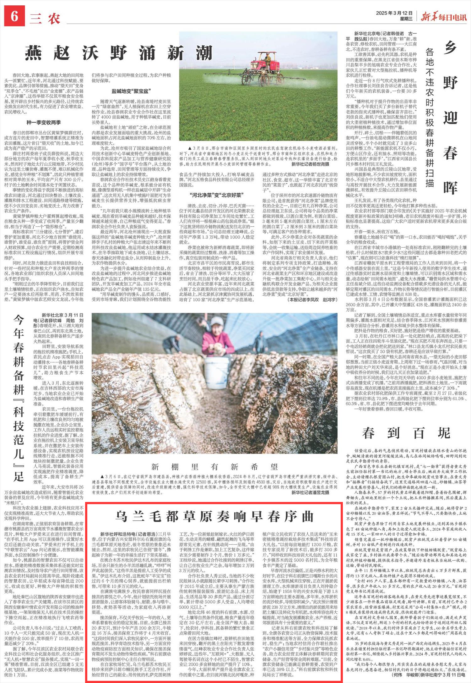 2025年3月12日,《新華每日電訊》第6版刊發(fā)題為《烏蘭毛都草原奏響早春序曲》的文章,報(bào)道了三月早春,位于內(nèi)蒙古興安盟科爾沁右翼前旗的烏蘭毛都草原天地蒼茫,銀冬雪原的景象還未褪去。然而,這里的農(nóng)牧民已告別“貓冬”,擼起袖子為新一年的幸福生活打下堅(jiān)實(shí)基礎(chǔ)。