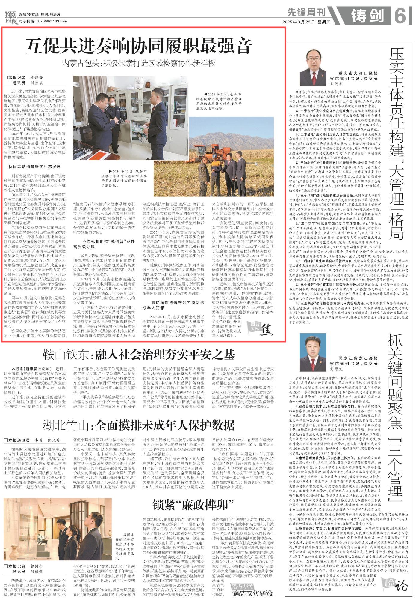 2025年3月28日,《檢察日?qǐng)?bào)》第6版刊發(fā)題為《互促共進(jìn)奏響協(xié)同履職最強(qiáng)音 內(nèi)蒙古包頭:積極探索打造區(qū)域檢察協(xié)作新樣板》的文章,報(bào)道了內(nèi)蒙古自治區(qū)包頭市檢察機(jī)關(guān)深入貫徹最高檢“探索建立基層院跨地區(qū)、跨層級(jí)共建互助機(jī)制”部署要求,積極探索全方位、多領(lǐng)域、深層次檢察協(xié)作機(jī)制,為攜手打造法治一體化樣板注入了強(qiáng)勁檢察動(dòng)能。