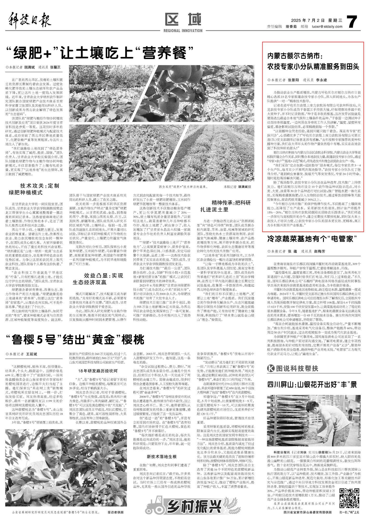 2025年7月2日《科技日報》第7版刊發(fā)了《內(nèi)蒙古額爾古納市:農(nóng)技專家小分隊精準(zhǔn)服務(wù)到田頭》的文章,報道了內(nèi)蒙古呼倫貝爾市額爾古納市積極與內(nèi)蒙古自治區(qū)農(nóng)牧業(yè)科學(xué)院、內(nèi)蒙古農(nóng)業(yè)大學(xué)等高校院所建立合作關(guān)系,同時整合本地農(nóng)技力量,組建農(nóng)技專家小分隊,通過“專家+農(nóng)戶”“基地+示范”模式,將先進(jìn)技術(shù)和理念送到農(nóng)業(yè)生產(chǎn)一線。