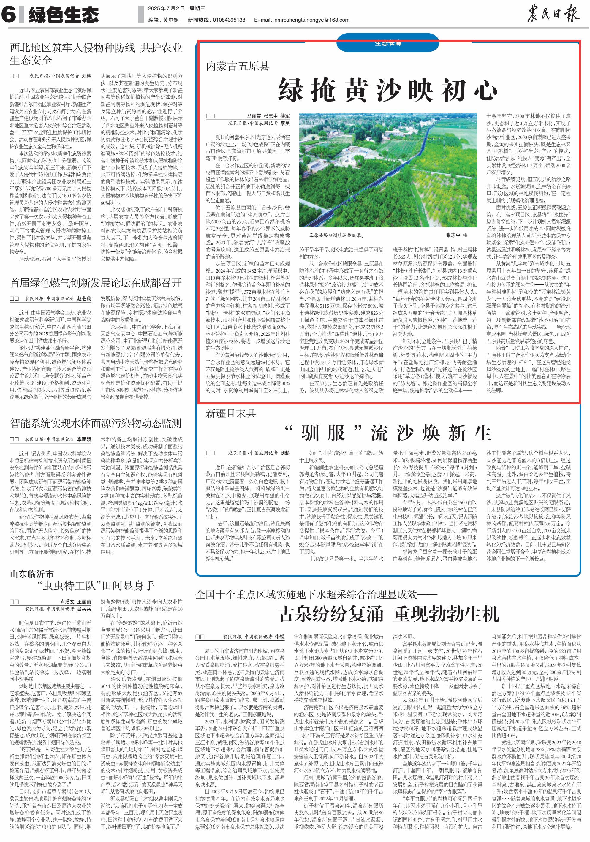 2025年7月2日《農(nóng)民日?qǐng)?bào)》第6版刊發(fā)了《內(nèi)蒙古五原縣綠掩黃沙映初心》的文章,報(bào)道了從黃河“幾字彎”到全域沙化土地,內(nèi)蒙古自治區(qū)巴彥淖爾市五原縣用十五年如一日的堅(jiān)守,詮釋著“綠水青山就是金山銀山”的深刻內(nèi)涵。當(dāng)沙地變成果園,當(dāng)林場(chǎng)變?yōu)榫皡^(qū),綠色,正成為五原縣高質(zhì)量發(fā)展最亮麗的底色。
