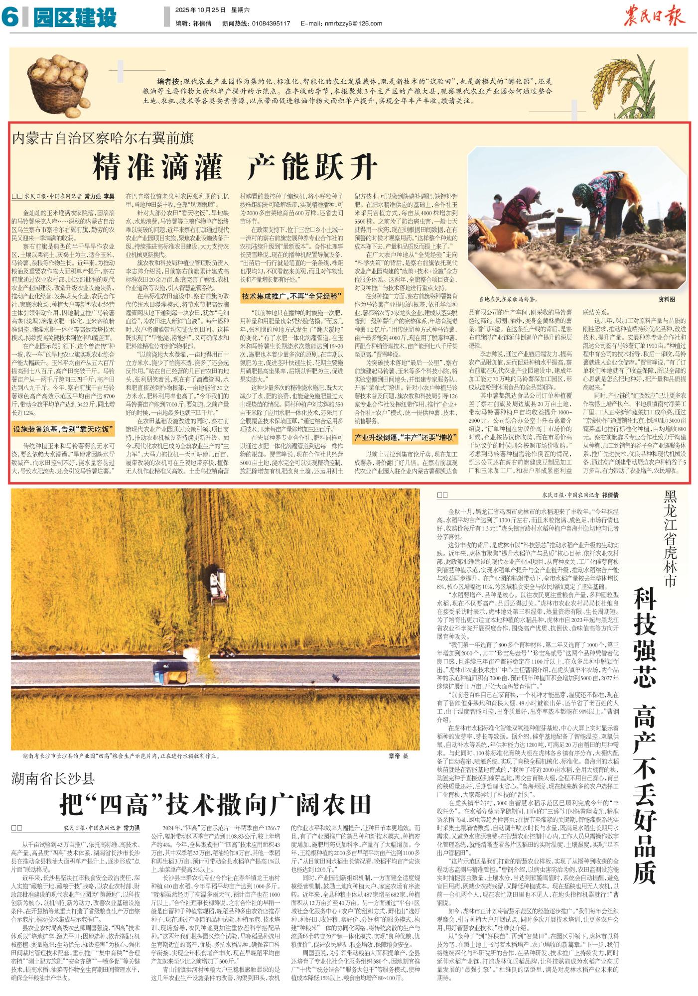 2025年10月25日,《農(nóng)民日?qǐng)?bào)》第6版刊發(fā)題為《內(nèi)蒙古自治區(qū)察哈爾右翼前旗:精準(zhǔn)滴灌 產(chǎn)能躍升》的文章,報(bào)道了內(nèi)蒙古烏蘭察布市察哈爾右翼前旗通過(guò)現(xiàn)代農(nóng)業(yè)產(chǎn)業(yè)園推廣滴灌水肥一體化等技術(shù),推動(dòng)玉米、馬鈴薯單產(chǎn)大幅提升,成功實(shí)現(xiàn)從“靠天吃飯”到科技增收的轉(zhuǎn)變。