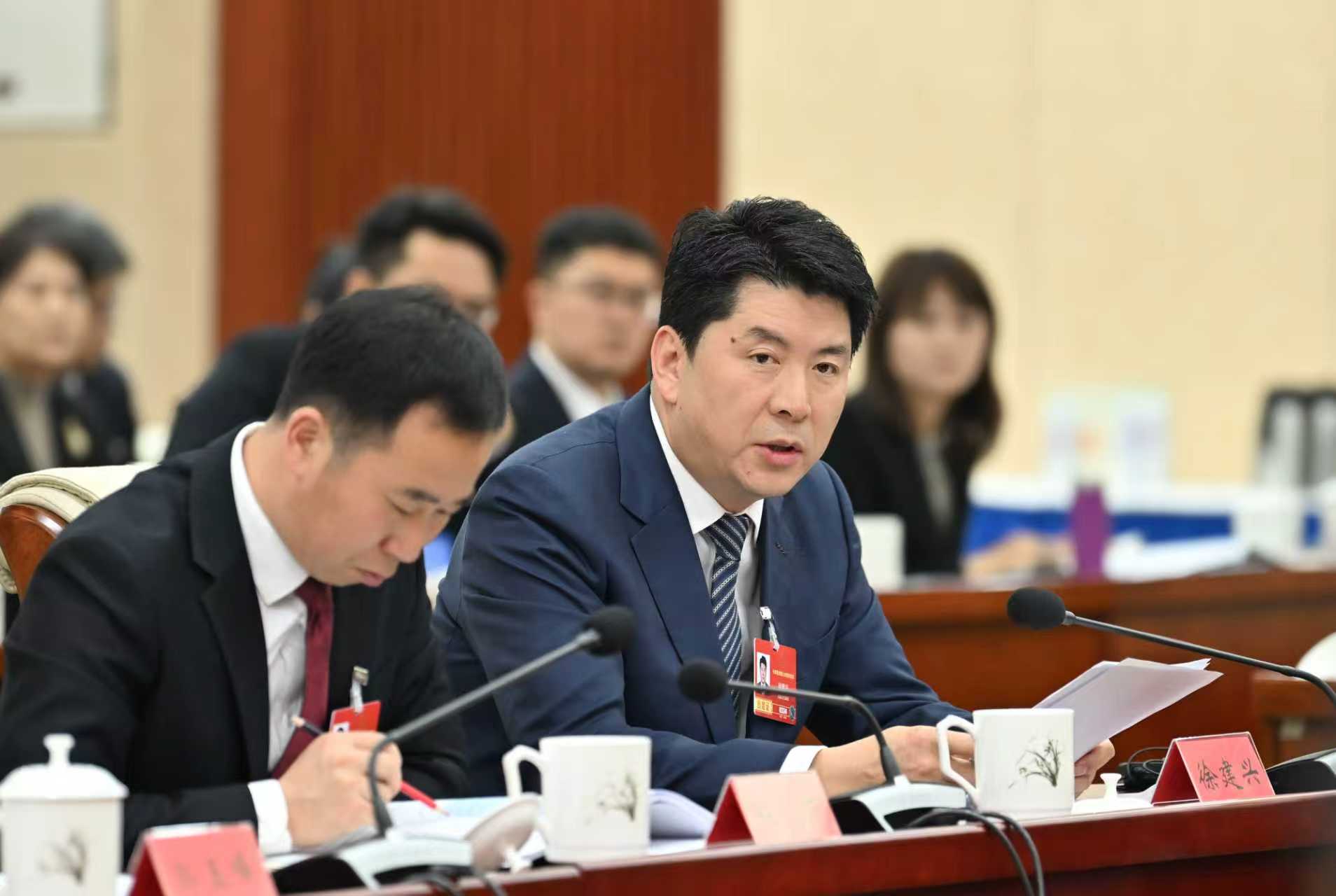 3月5日,全國人大代表徐建興(右一)建議加大對農(nóng)業(yè)企業(yè)科技創(chuàng)新的扶持力度,鼓勵企業(yè)與科研院所、高校合作,開展品種改良、精深加工等技術(shù)攻關(guān)。草原云記者
