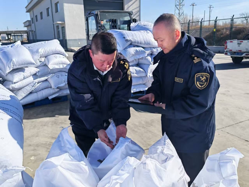 集寧海關(guān)關(guān)員對出口葵花籽進(jìn)行現(xiàn)場查驗(yàn)