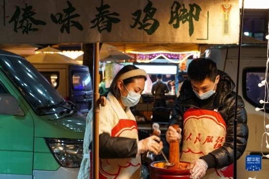 在四川省成都市錦江區(qū)三色路夜市,攤主在制作小吃(2月28日攝)。