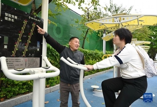 4月24日,西河智慧體育公園工作人員(左)向晨練的市民介紹具備對(duì)運(yùn)動(dòng)數(shù)據(jù)進(jìn)行采集、分析等多項(xiàng)功能的智能競賽健身車。