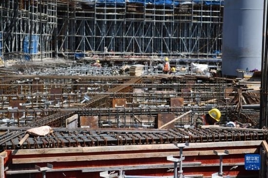 5月1日,在浙江省杭州市臨平區(qū)一個項目工地,中建三局的建設(shè)者在施工中。