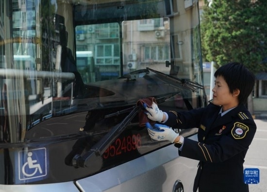 5月1日,在位于北京市朝陽區(qū)的柳芳公交場站,104路公交車駕駛員高國然在發(fā)車前進行出車?yán)龣z。