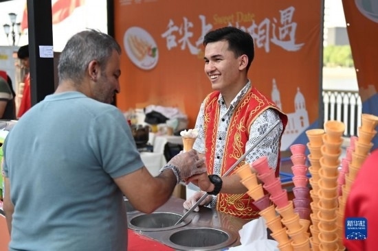 5月15日,游客在現(xiàn)場品嘗土耳其冰淇淋。