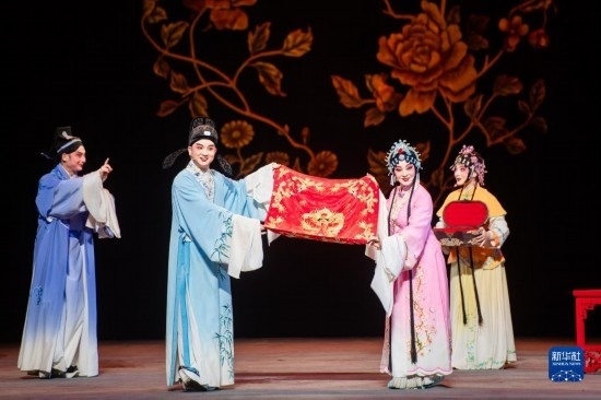 5月15日,演員在舞臺(tái)上表演黃梅戲《羅帕記》。