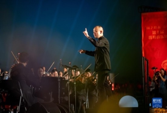 來(lái)自昆明聶耳交響樂團(tuán)及昆明市民族歌舞劇院民樂團(tuán)的演奏家們?cè)诶ッ魇械岢嘏瞎餐葑喟ā读x勇軍進(jìn)行曲》《賣報(bào)歌》在內(nèi)的聶耳代表作(7月17日攝)。