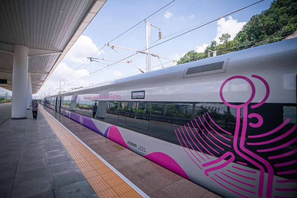 這是亞運智能動車組??吭诘虑逭菊九_(2023年8月4日攝)。新華社記者 江漢 攝