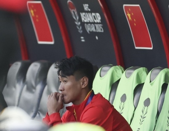 1月13日,中國(guó)隊(duì)對(duì)陣塔吉克斯坦隊(duì),圖為因傷未能進(jìn)入名單的韋世豪賽前在替補(bǔ)席上。新華社記者 曹燦 攝