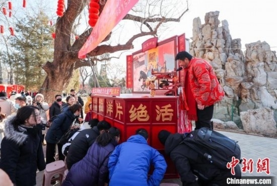 2月10日,大年初一,第三十八屆龍?zhí)洞汗?jié)文化廟會在北京龍?zhí)豆珗@開門迎客。圖為市民和游客在廟會上觀看老北京絕活“拉洋片”。中新社記者 賈天勇 攝