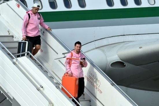 2月2日,梅西與其效力的邁阿密國(guó)際隊(duì)抵達(dá)香港國(guó)際機(jī)場(chǎng),圖為梅西(右)與蘇亞雷斯走下舷梯。新華社記者 盧炳輝 攝