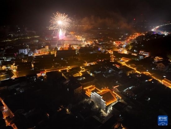 2月23日晚,古鎮(zhèn)舉行放銃花活動(dòng)(無人機(jī)照片)。