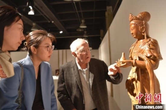 當(dāng)?shù)貢r間8月12日,巴西圣保羅州坎皮納斯市,“中國藝術(shù)五千年 塞奎拉·萊特收藏”啟幕。圖為巴西文物修復(fù)師毛羅·里貝羅(右一)講解如何修復(fù)木雕觀音像。中新社記者 林春茵 攝