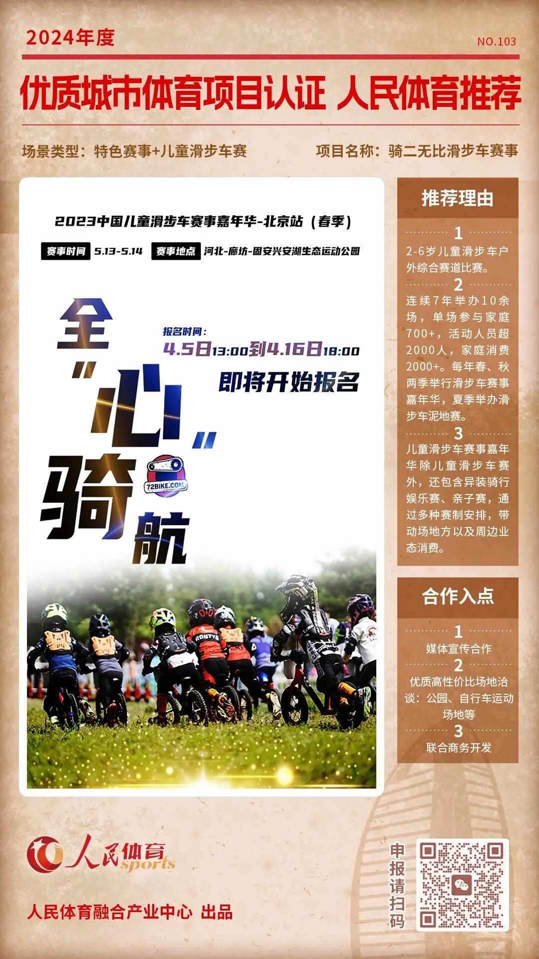 “優(yōu)質(zhì)體育賽事及活動認(rèn)證推薦計劃”是人民體育“城市體育產(chǎn)業(yè)高質(zhì)量發(fā)展計劃”的重要組成部分,人民體育一直致力于攜手權(quán)威機(jī)構(gòu)、組織單位等聯(lián)合推薦優(yōu)質(zhì)項目,項目類型包括且不限于賽事、活動,也涵蓋產(chǎn)品與服務(wù)類別。旨在以更客觀的角度,展示在體育產(chǎn)業(yè)發(fā)展中有所創(chuàng)新,有所價值的項目,促進(jìn)多方相互了解,融合發(fā)展。