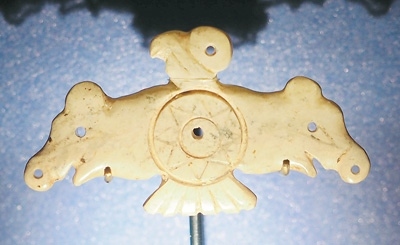 玉鷹是凌家灘文化最具代表性的器物之一。鷹側(cè)首傲視,雙翅張開(kāi),翅端各為一豬首形象,可能以豬作為財(cái)富的象征。鷹腹刻八角星紋,這種紋樣在凌家灘出土的玉版和新石器時(shí)代眾多陶器上都有出現(xiàn)。這件玉鷹可能是舉行祭祀儀式時(shí)所用之物,鷹、豬、八角星紋集于一器,體現(xiàn)了先民崇尚萬(wàn)物有靈的宇宙觀。
