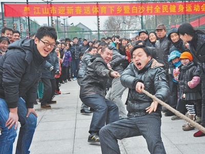 白沙村村民在村全民健身運(yùn)動(dòng)會(huì)上進(jìn)行拔河比賽。