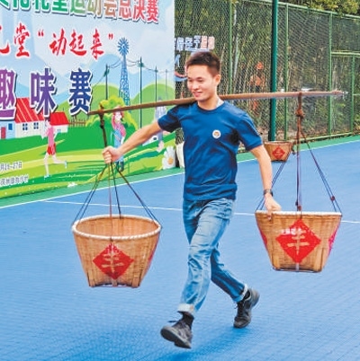 在白沙村舉辦的浙江省農(nóng)村文化禮堂運(yùn)動(dòng)會(huì)總決賽上,村民參與挑扁擔(dān)比賽。