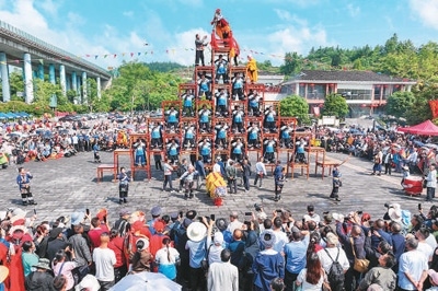 湖南省湘西土家族苗族自治州吉首市,民間藝人為游客表演獅子登高。