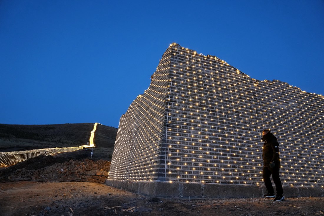12月30日,工作人員在崇禮長(zhǎng)城景觀展示亮化工程現(xiàn)場(chǎng)巡查。新華社記者 牟宇 攝