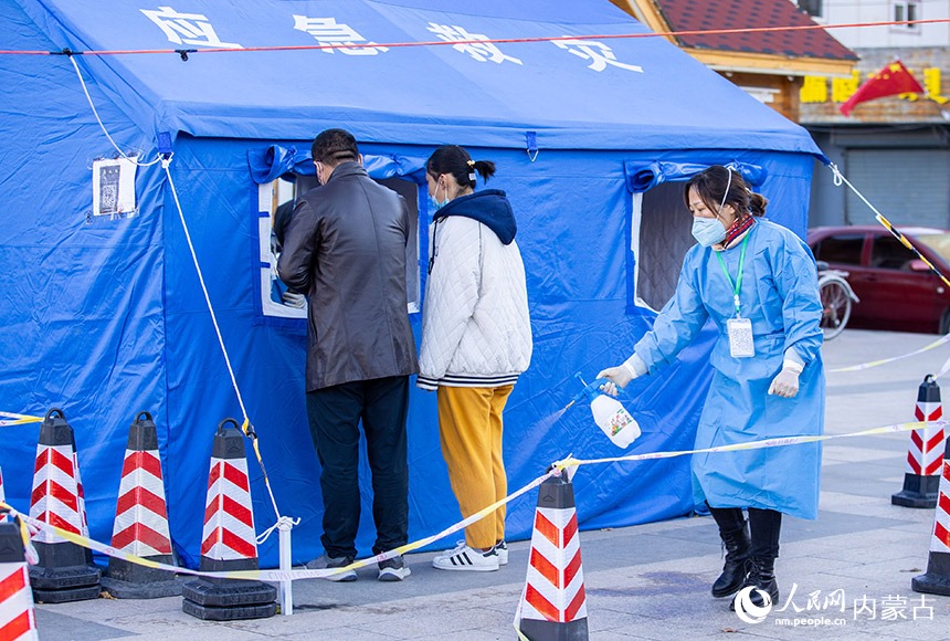 呼和浩特市玉泉區(qū)一處核酸篩查點(diǎn),社區(qū)工作者對(duì)核酸采樣現(xiàn)場(chǎng)進(jìn)行消殺。丁根厚攝