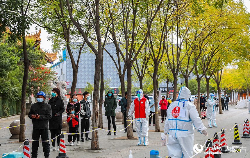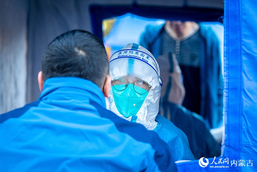呼和浩特市玉泉區(qū)一處核酸采樣點(diǎn),醫(yī)護(hù)人員為居民進(jìn)行核酸檢測(cè)。丁根厚攝