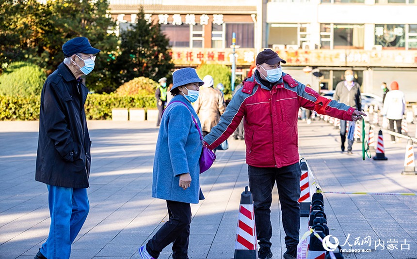 呼和浩特市玉泉區(qū)一處核酸篩查點(diǎn),工作人員引導(dǎo)老年人通過(guò)綠色通道接受核酸檢測(cè)。丁根厚攝